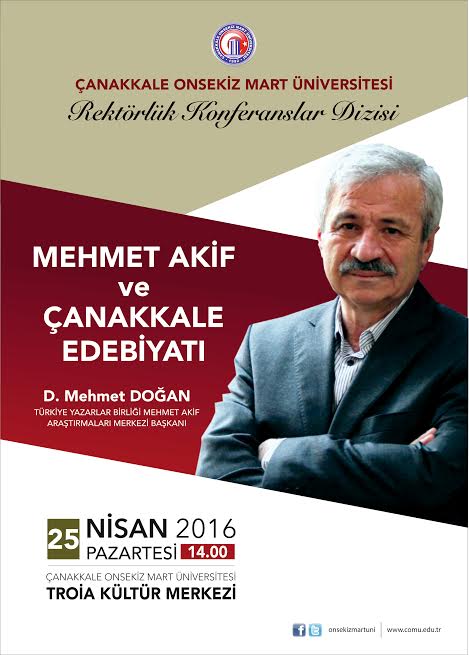 TYB Vakfı Mehmet Akif Ersoy Araştırmaları Merkezi Başkanı D. Mehmet Doğan 25 Nisan Pazartesi günü Çanakkale Onsekiz Mart Üniversitesi’nde “Mehmet Âkif ve Çanakkale edebiyatı” konulu bir konferans verecek.