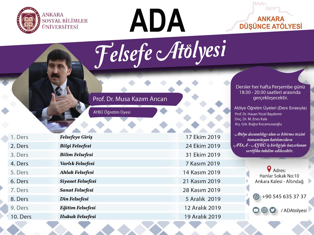 “Ankara'nın Sosyal, Kültürel ve Sanatsal Hayatına Mütevazı Bir Soluk” sloganı ile çalışmalarını sürdüren ADA’ da; Prof. Dr. Arıcan’ın yönetimindeki Felsefe Atölyesi 17 Ekim 2019 tarihinde başlayacak ve 2019-2020 Güz Yarıyılı 29 Aralık 2019 tarihinde sona erecek.