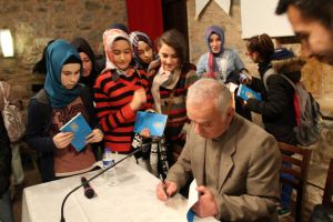 Prof. Dr. Mustafa Kara, sohbetinin sonunda o çok sevdiği “torunlarına” kitabını imzaladı.