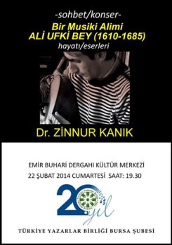 Türkiye Yazarlar Birliği Bursa Şubesi’nin organize ettiği “Emir Buhari Sohbetleri”nin 22 Şubat Cumartesi gecesi düzenlenen programına ehl-i dîl bir bilim adamı Dr. Zinnur Kanık konuktu. Dr. Zinnur Kanık, UÜ Türk Din Musikisi Anabilim Dalı’nda çalışmalarını sürdüren bir akademisyen aynı zamanda. Dr. Kanık, sadece akademik çalışmalar yapan bir müzisyen değil, bir icracı. Dr. Zinnur Kanık ve arkadaşları Mahmut Şevket Öztürk, Serdar Uysal, Harun Curave Mert Şen, Emir Buhari Sohbetleri’nde düzenlenen programda biz dinleyenlere hem önemli bir musiki ustası olan Ali Ufki hakkında bilgi verdiler, hem de Ali Ufki’nin eserlerinden örnekleri seslendirdiler.