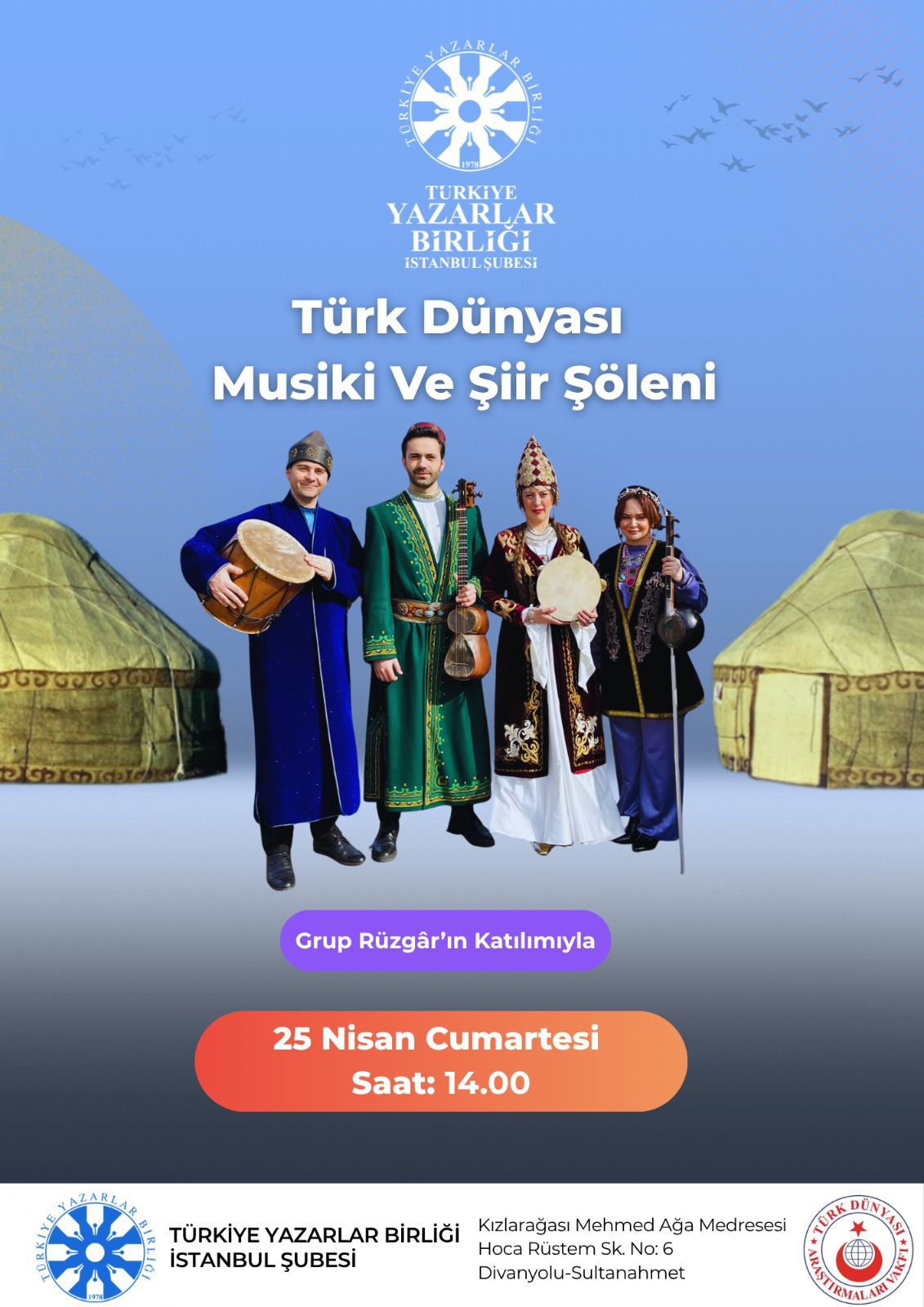Etkinlik, Grup Rüzgâr’ın katılımıyla gerçekleştirilecek olup, geleneksel çalgılar eşliğinde icra edilecek eserlerle dinleyiciler Türk dünyasının ortak hafızasında bir yolculuğa davet edilecek.