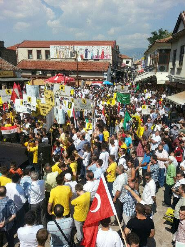 Makedonya'daki birçok sivil-toplum kuruluşunun bir araya gelmesi ile tertiplenen ve "Hepimiz Rabiayız" sloganı ile yapılan gösteriye binlerce Makedonyalı Müslüman katıldı.